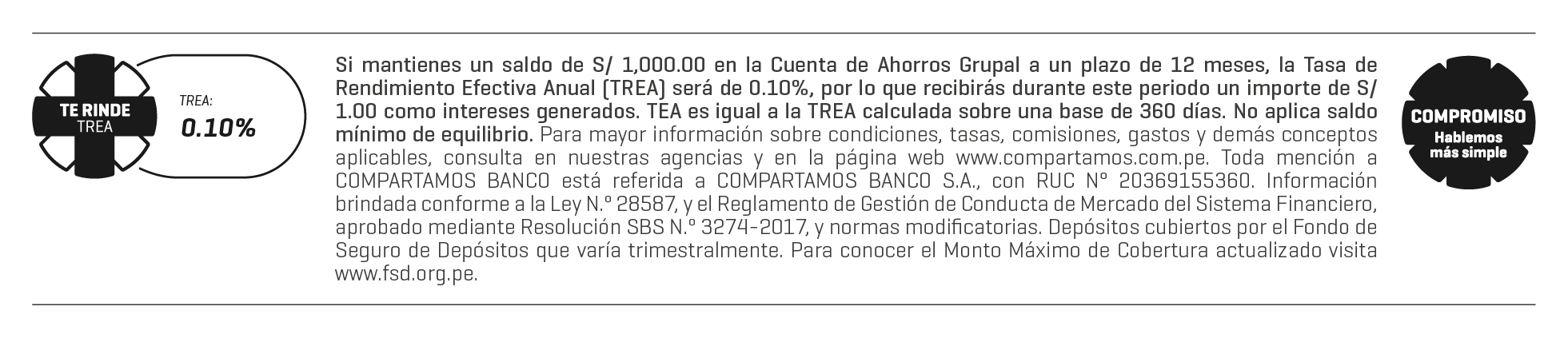 No necesitas monto mínimo para abrir la cuenta, ya que está diseñada bajo la metodología del Crédito Grupal y te servirá para que empieces a mejorar tu cultura de ahorro.